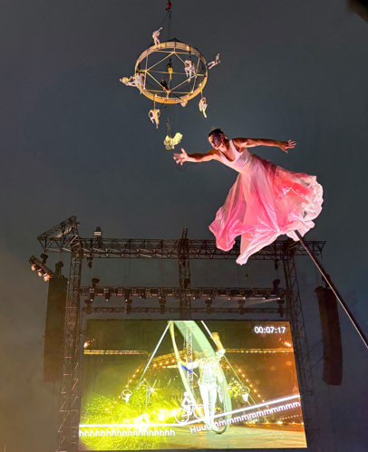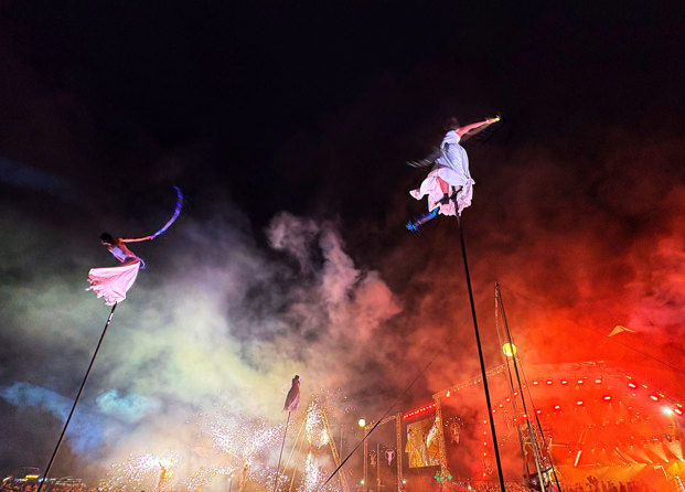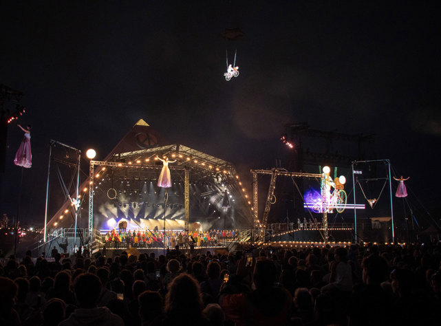 The show was packed with aerial spectacle and striking visuals, including cloud swing, Spanish web, sway poles, Cyr wheel, hand balancers, fire artists, jugglers, and aerialists flying 30 metres above the Pyramid Stage on two towering cranes. These were brought to life alongside live Taiko drumming, marching bands, and a 200-strong choir; a cast of over 300 in total.